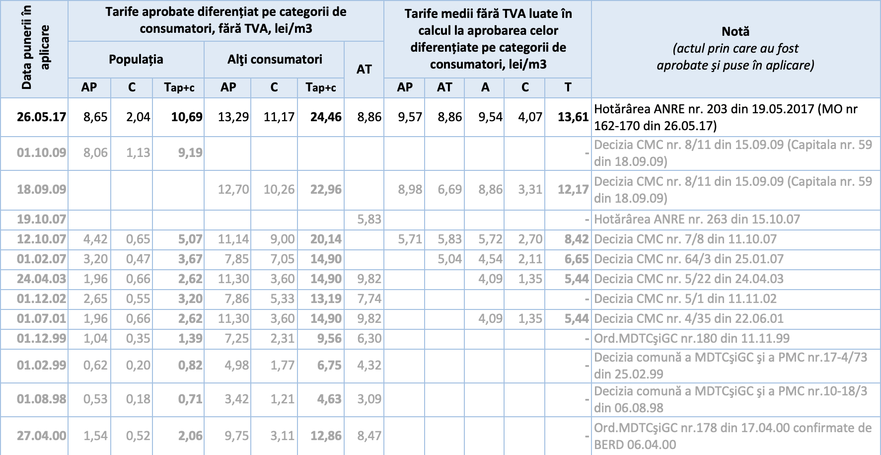 | 2017 | Scrisoarea nr. 01-533 din 22.03.2017 | A fost aprobată, cu ajutări, prin Hotărârea ANRE nr. 203 din 19.05.2017 |